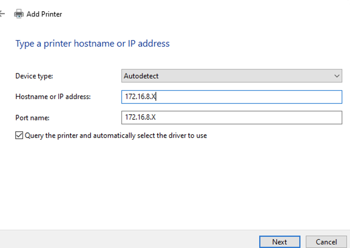 Type the desired IP address of the printer of choice from the list above, then click Next.