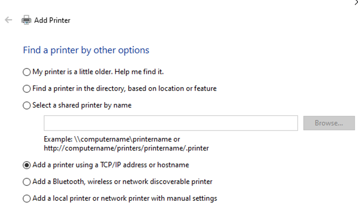 Click the button for Add a printer using a TCP/IP address or Hostname.